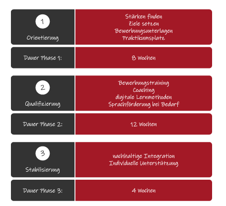 Die anschließende Qualifizierungsphase umfasst die Unterstützung bei der Suche nach einer passenden Arbeits- oder Weiterbildungsstelle, ergänzt durch Sprachförderung, Bewerbungstraining und den Einsatz digitaler Lernprogramme.